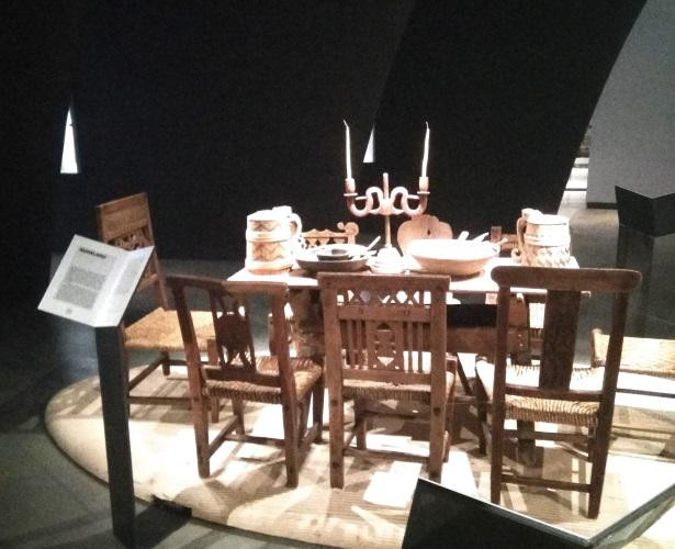 Вся эта повседневность чудно сочетается с этнографическими предметами и красивыми дорогими витринами. Дизайнеры очень хорошо постарались. Экспозиция из тех, что интересны и детям, и взрослым одинаково: можно зайти в избу коми, амбар удмуртов, карельскую баню, вежу саамов, лесной лагерь хантов, услышать обрядовые песни, почувствовать холодок на коже от приглушенного света и ощущения леса и диких зверей поблизости.